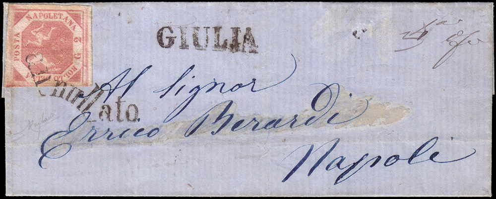 Lettera senza testo da Giulia per Napoli, affrancata con 2gr. rosa chiaro I tavola, annullato con "svolazzo" tipo 12 e sul frontespizio lineare "GIULIA". Da esaminare