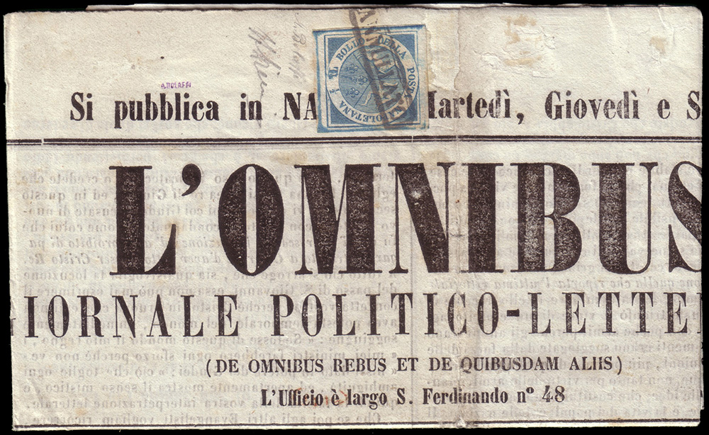 Newspaper "The Omnibus" sent from Naples and franked with ½t. blue "Trinacria".