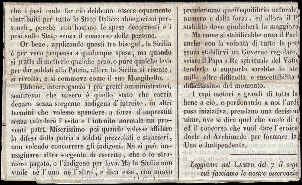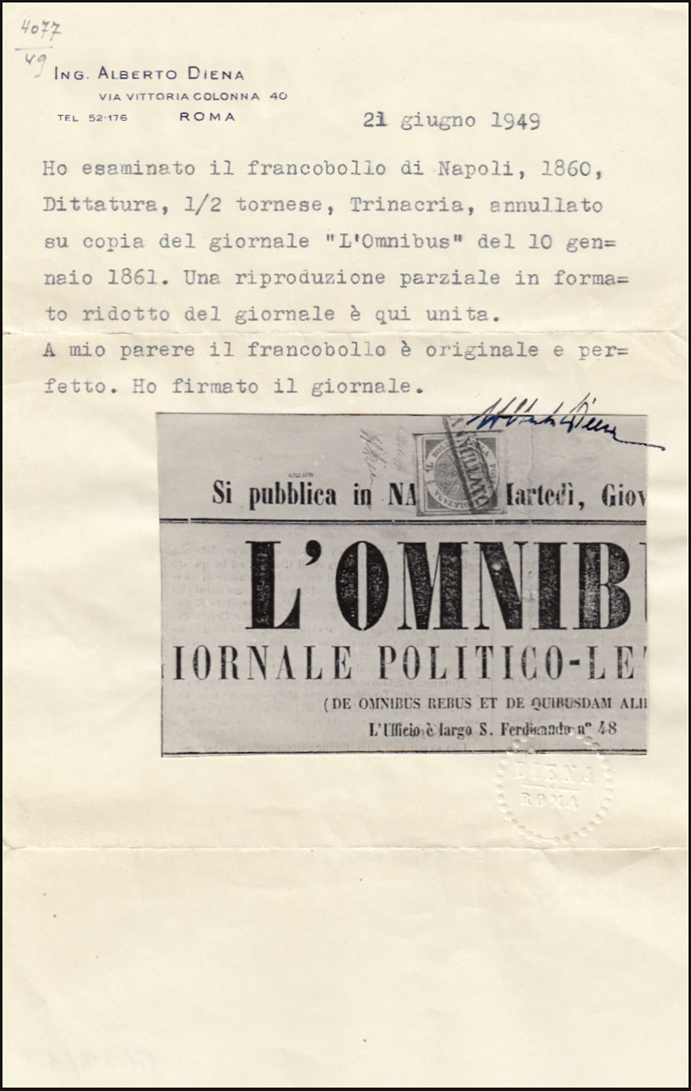 Giornale "L'Omnibus" spedito da Napoli e affrancato con ½t. azzurro "Trinacria"