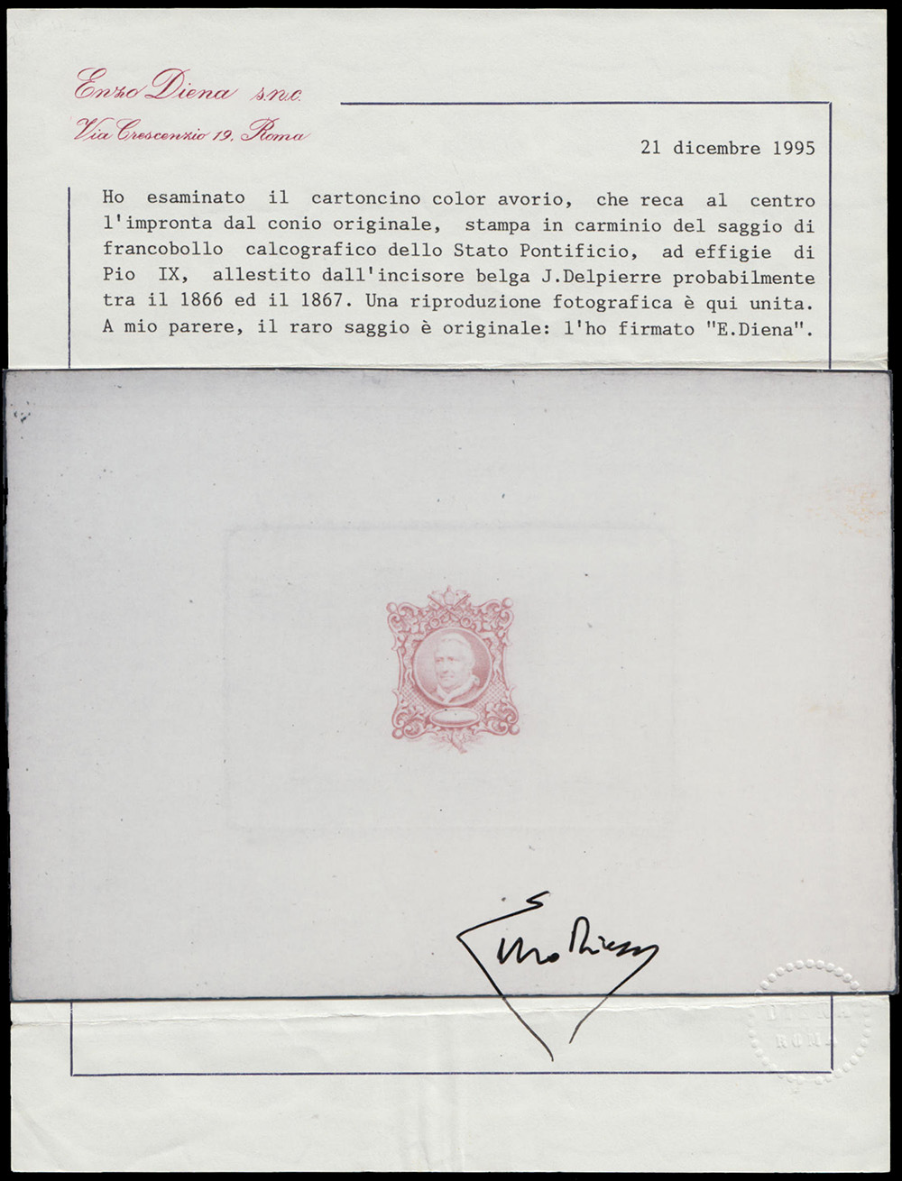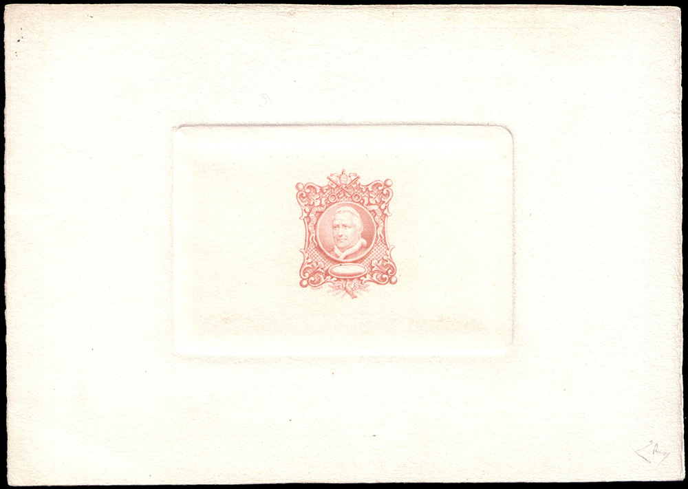 Saggi. Cartoncino color avorio, con al centro l'impronta del conio originale, stampata in carminio, del saggio calcografico con effigie di Pio IX, allestita dall'incisore belga J. Delpierre