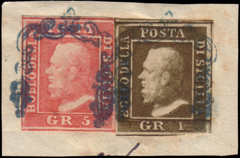 SICILIA 1859Frammento con 1gr. verde oliva scuro e 5gr. rosa carminio...