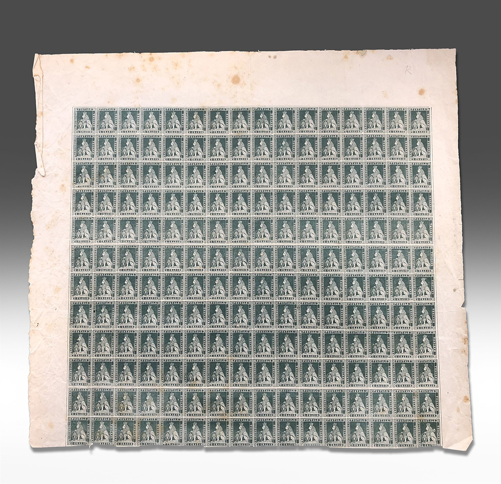 Prove. Blocco di 192 esemplari del 2cr. verde stampato su carta bianca senza filigrana. Usuali pieghe d'archivio. Da esaminare
