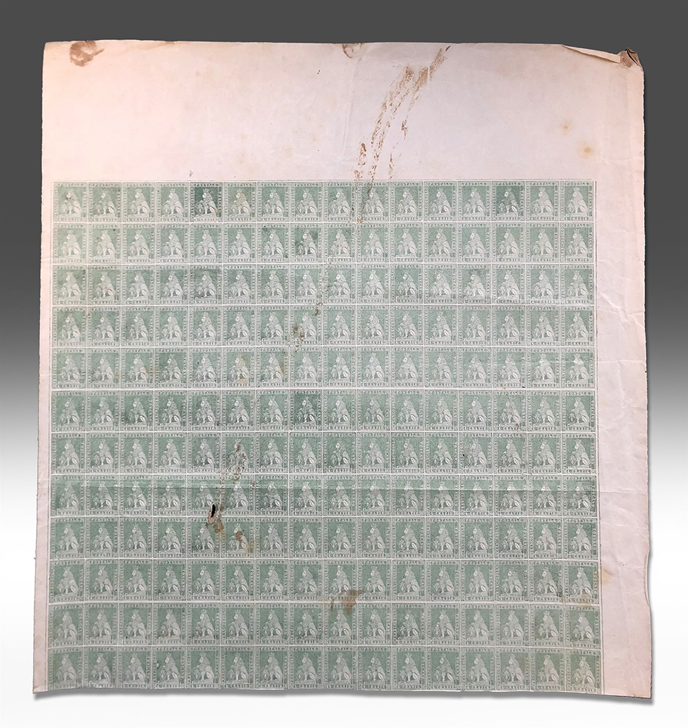 Prove. Blocco di 192 esemplari del 4cr. verde chiaro stampato su carta bianca senza filigrana. Interessante "taccheggio" sull' esemplare pos. 5. Usuali pieghe d'archivio. Da esaminare