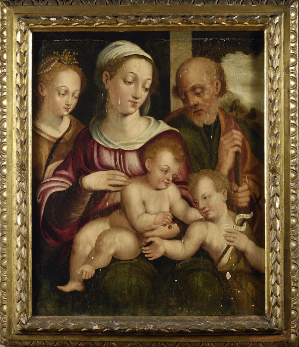 Scuola Toscana, XVI sec. Sacra Famiglia con San Giovannino Olio su tavola, cm. 67x54