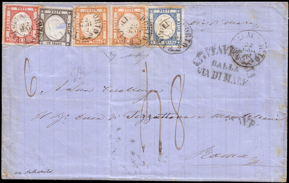 Falsi dell'epoca. Lettera quadricolore senza testo da Napoli per Roma, affrancata per 28gr. con 2 esemplari del 10gr. arancio, falso tipo II, effIgie C, 5gr. vermiglio, 2gr. azzurro e 1gr. nero (difettoso). Da esaminare