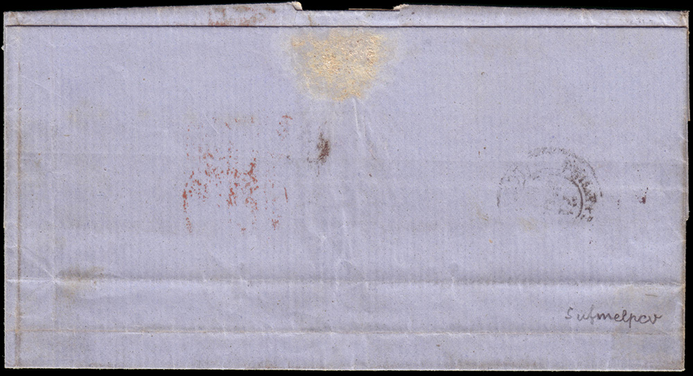Falsi dell'epoca. Lettera con testo spedita da Napoli per Philippeville (Algeria francese), affrancata per 35gr. con 20gr. giallo arancio falso (effigie appiattita), 5gr. carminio con doppia effigie e 2 esemplari del 5gr. rosa