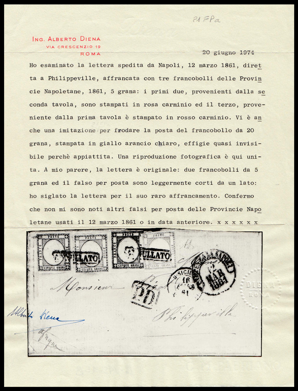 Dal certificato di Alberto Diena del 20 giugno 1974 "Non mi sono noti altri falsi per posta delle Province Napoletane usati il 12 marzo 1861 o in data anteriore"