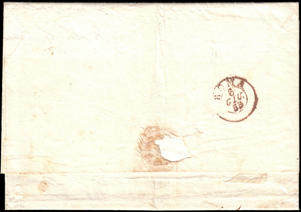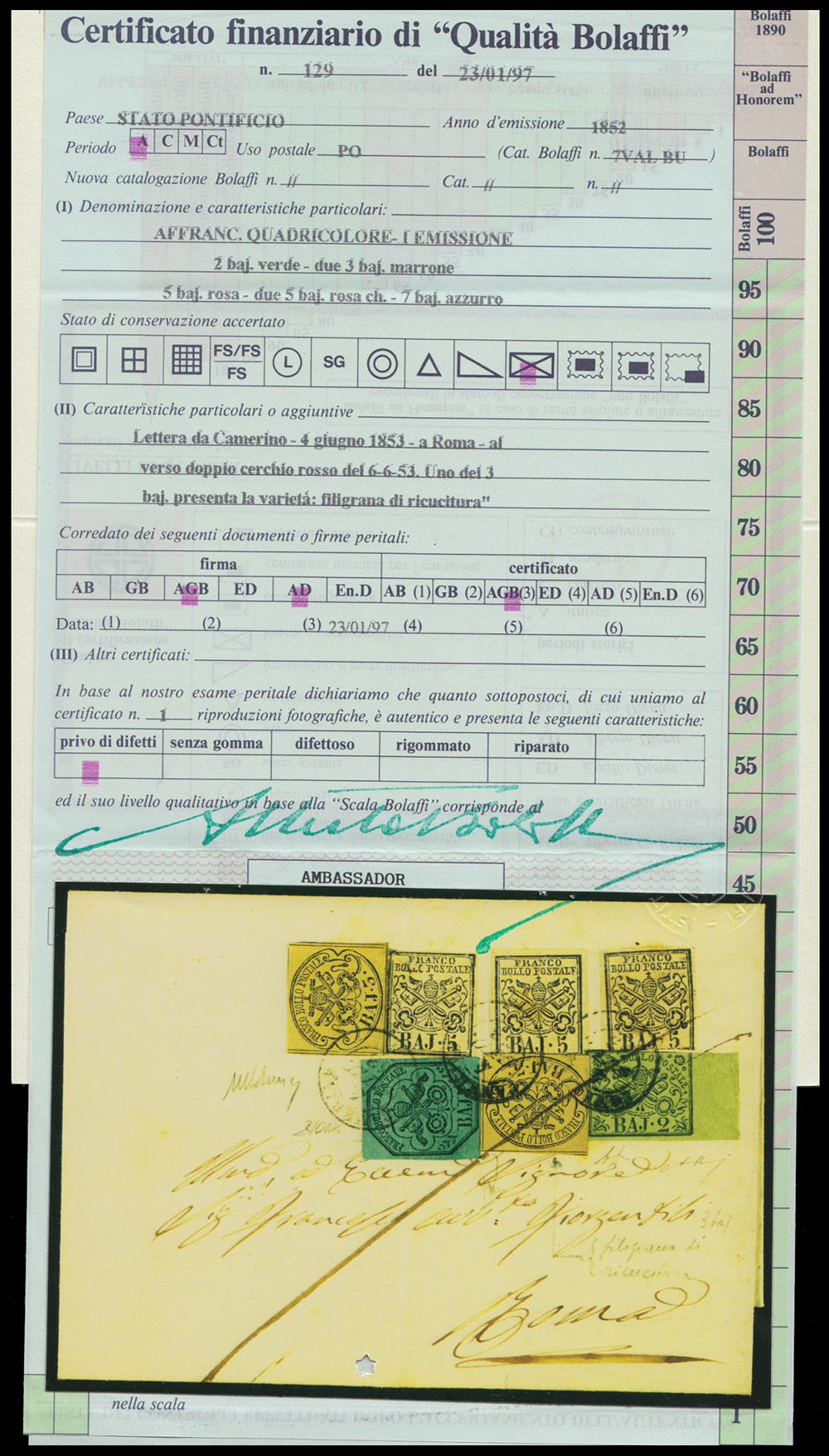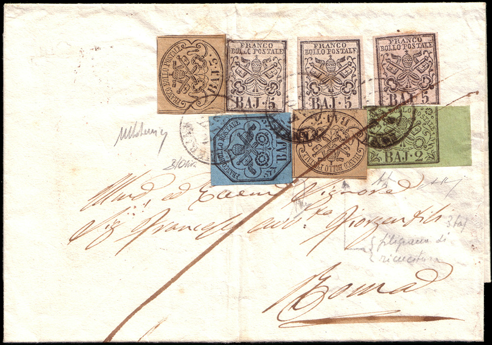 Lettera quadricolore, con testo, da Camerino per Roma affrancata per 30b. con un 7b. azzurro, 3 esemplari da 5b. rosa chiaro, 2 esemplari del 3b. bruno (di cui uno con filigrana di ricucitura) e un 2b. verde oliva. Da esaminare