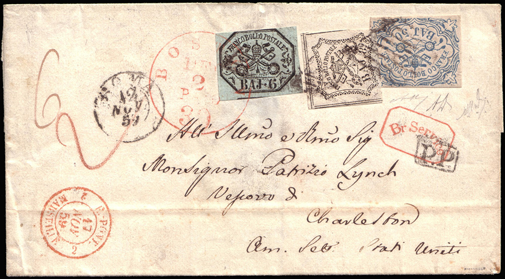 Lettera senza testo spedita da Roma per Charlestone (Stati Uniti) affrancata per 64b. con 50b. azzurro, 8b. bianco e 6b. grigio verdastro