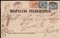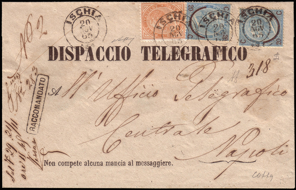 Busta prestampata "DISPACCIO TELEGRAFICO / Non compete alcuna mancia al messaggiere." da Ischia per Napoli affrancata per 50c. con 2 esemplari del 20/15c. celeste chiaro e 10c. ocra arancio