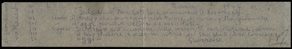 Messaggio scritto su carta estremamente leggera e trasportato a mezzo piccione viaggiatore dalla Colombaia militare di Roma al Guardacolombaio di La Maddalena