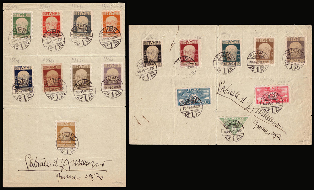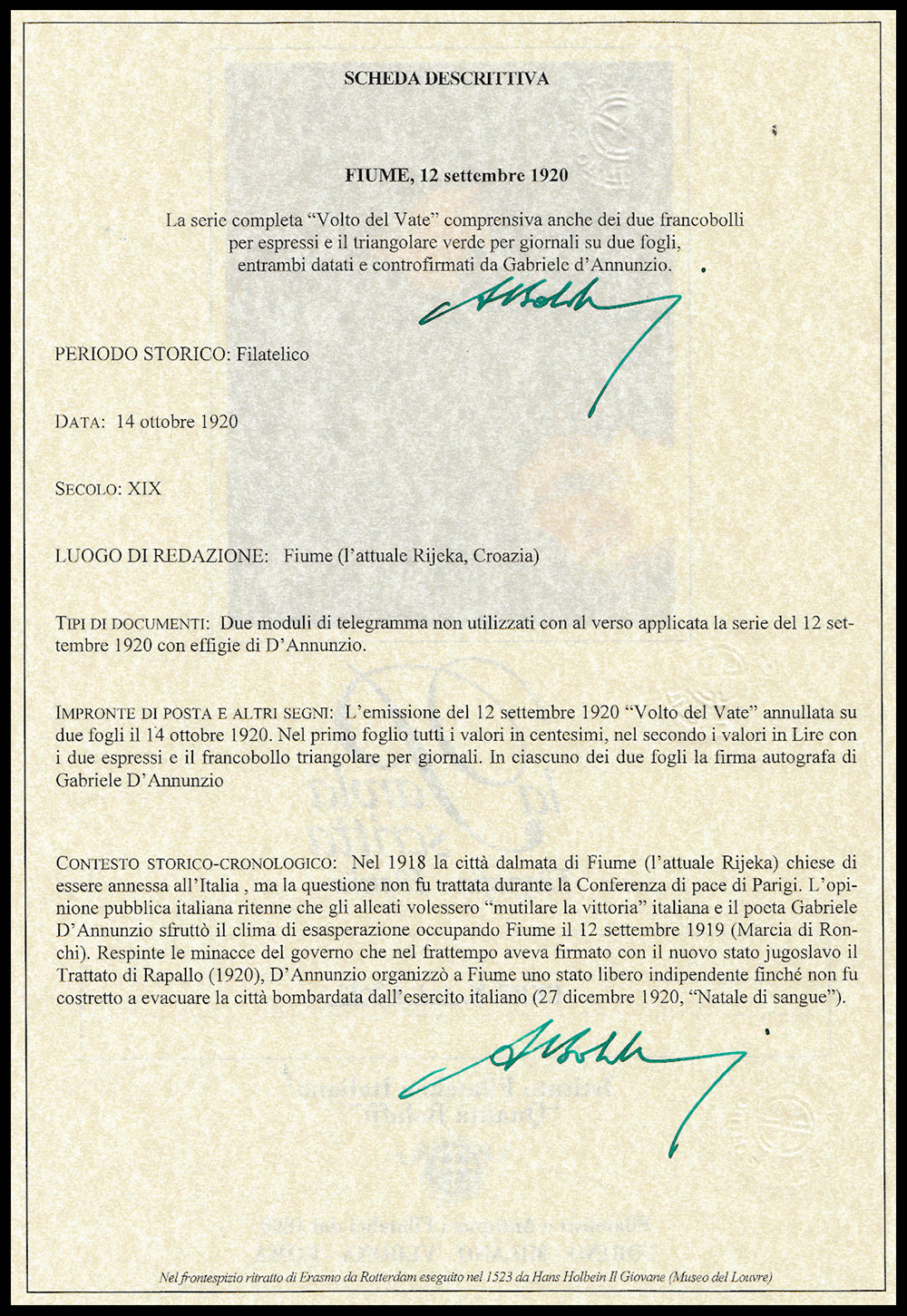 L'emissione di posta ordinaria, espressi e segnatasse, emessa il 12 settembre 1920 annullata su 2 fogli entrambi firmati da Gabriele D'Annunzio