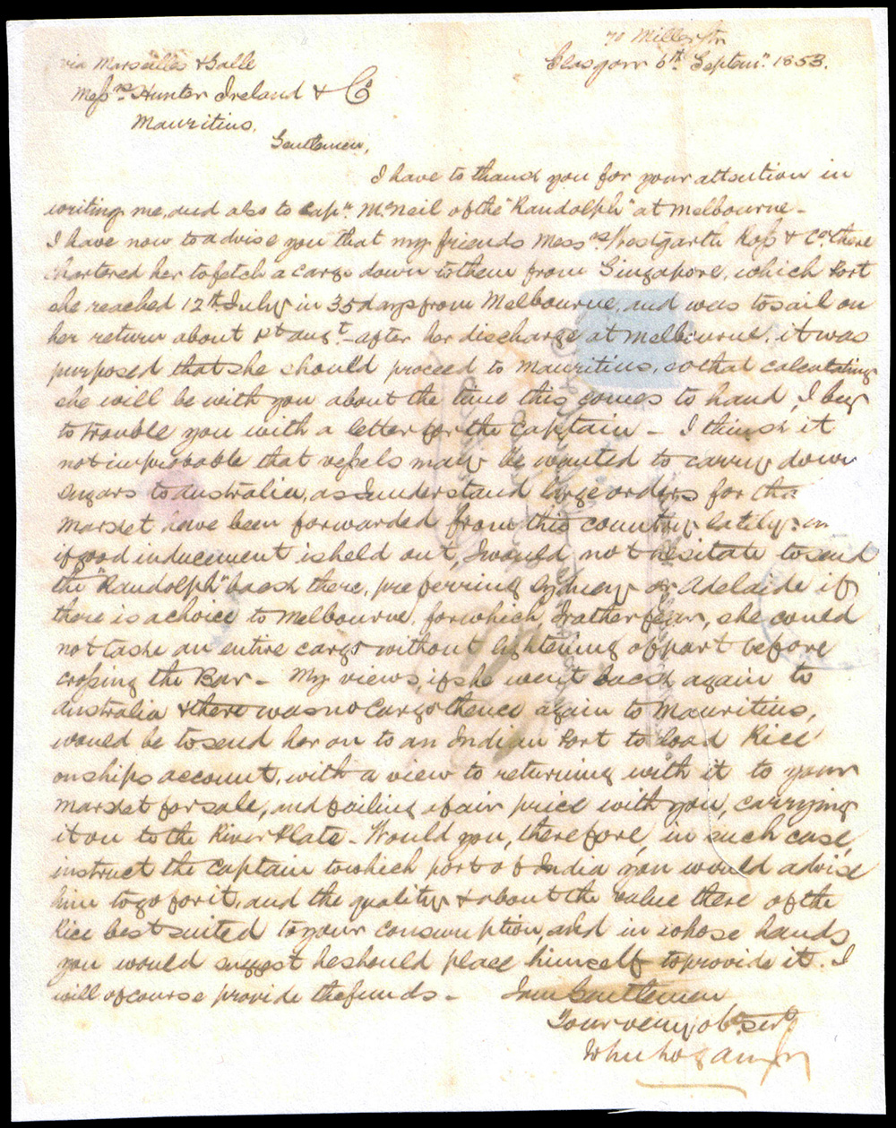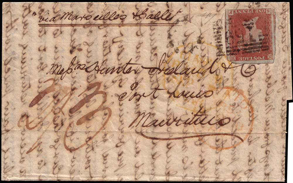 Letter with text from Glasgow, via Marseilles, Port Louis (Mauritius), franked with 1d. red brown.