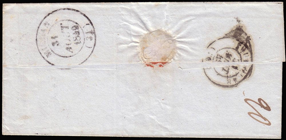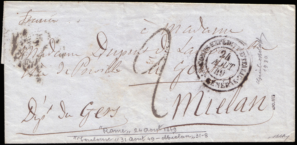 Lettera non affrancata, tassata, spedita da Roma per Mielan con timbro "CORPS EXPEDITIONNAIRE D'ITALIE / Q.er GENERAL"