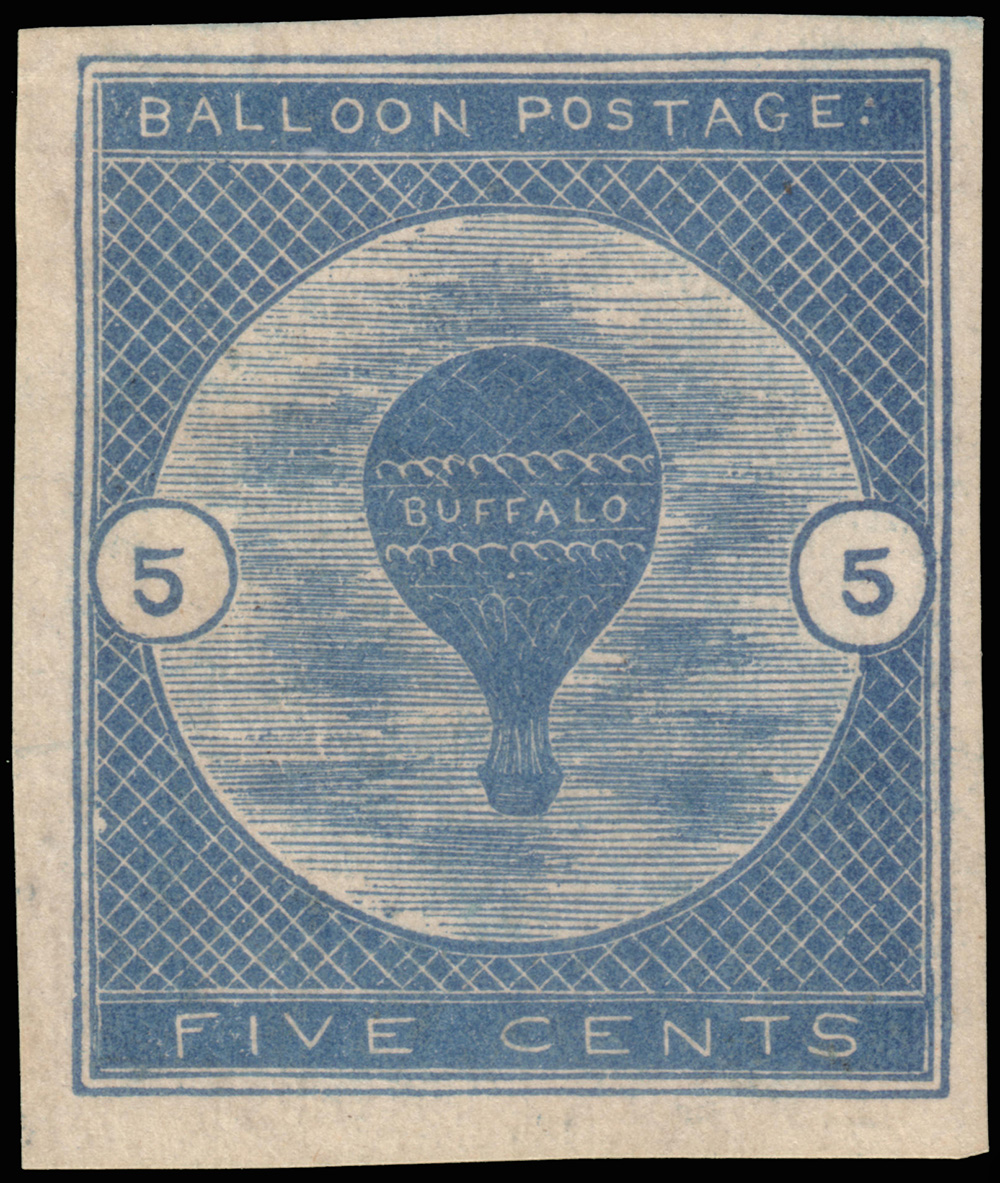 Posta aerea. 5c. azzurro scuro "Buffalo Balloon". Uno dei 300 esemplari semi ufficiali approntati per integrare la normale affrancatura postale delle lettere trasportate da Nashville a Gallatin (Tennessee), sul pallone aerostatico "Buffalo"