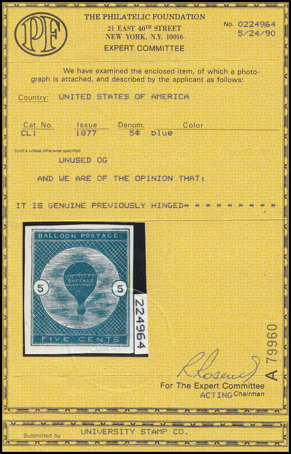 STATI UNITI 1877Posta aerea. 5c. azzurro scuro "Buffalo Balloon". Uno dei 300...