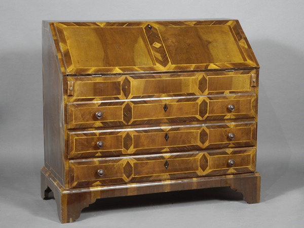 Ribalta in palissandro e vari legni, con specchiature sui tre cassetti frontali, scarabattolo interno a cinque cassettini e vari ripiani, piedi a mensola, Liguria, XVIII sec., cm. 107x117x56.