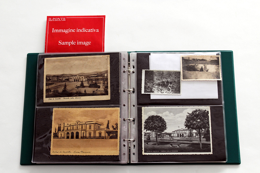 Collezione formata da circa 1000 cartoline, sia nuove che viaggiate, principalmente di Città di Castello e della zona di Perugia, con vedute, architettura e paesaggi, alcune animate. Allegata una sezione di storia postale e documentale. In 25 raccoglitori, in allegato il volume di Alvaro Tacchini, "L'alta valle del Tevere in cartolina". Da esaminare