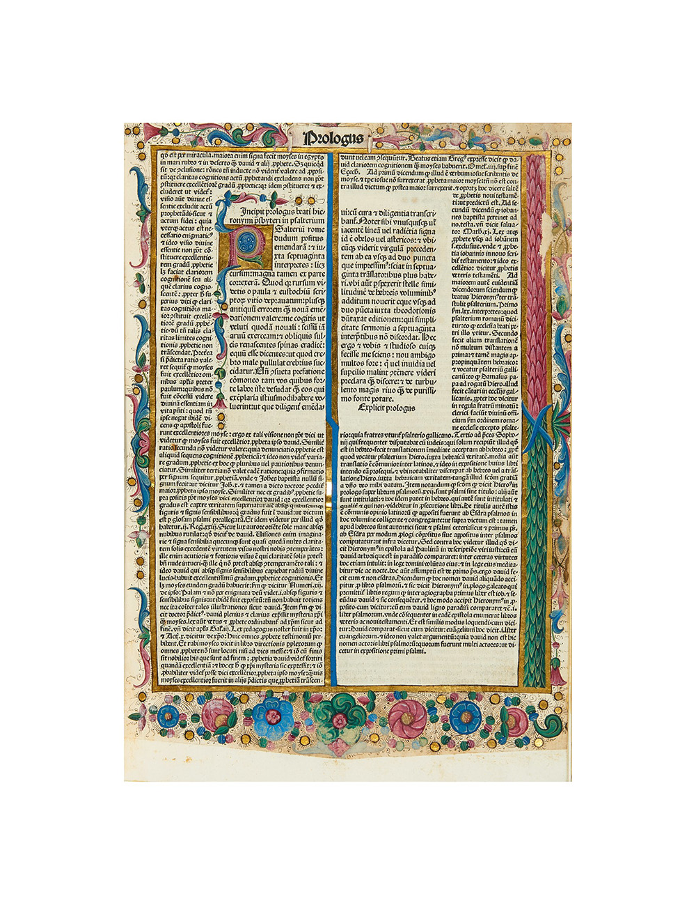 a2 recto illuminated in Italian Renaissance style, with floral decoration in blue, pink, green and gilt within a gilt frame, capitals added in different type in red and blue ink in the first section (a few in filigree decoration), in the second section initials in red ink with some additional flower ornaments in blue and red ink.
