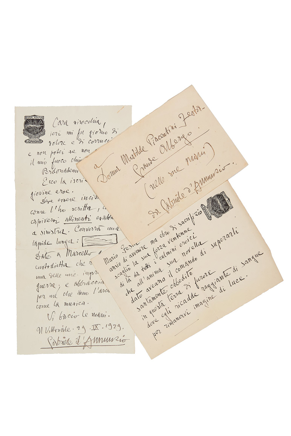 Lettera su carta intestata "Semper adamas" (2 carte, dimensioni differenti: 505 x 241 e 240 x 325 mm), scrittura autografa, inchiostro nero. Una busta con tre sigilli in ceralacca blu ("Donna Matilde Piacentini Festa Grande Albergo (nelle sue mani) da Gabriele D'Annunzio") (lievi macchie e lievi strappi). E' unita una riproduzione della seconda carta della lettera contenente l'iscrizione funeraria. Provenienza: annotazione manoscritta in matita "Proprietà Donna Matilde Piacentini Festa a mezzo On. Oppo" (carta 2 verso).