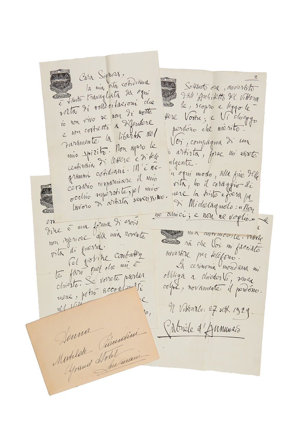 Lettera autografa in cui D'Annunzio invia le proprie accorate scuse a Donna Matilde Festa Piacentini per non aver aperto né letto le sue lettere dicendosi "costretto a difendere duramente la libertà del mio spirito"; e prosegue invitandola al Vittoriale e mettendole a disposizione la propria automobile all'Hotel dove lei alloggia. Matilde Festa Piacentini fu pittrice e mosaicista italiana, moglie di Marcello Piacentini, architetto in auge durante il regime fascista.
