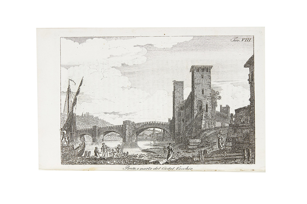 2 parti in un volume, 8vo (224 x 140mm). 35 tavole incise in rame che includono una pianta ripiegata della città di Verona e la carta geografica della provincia (pianta di Verona con piccolo strappo, alcune lievi fioriture). Legatura in mezza pelle coeva con angoli, etichette al dorso in marocchino rosso (lievi difetti), custodia moderna. Provenienza: Louis Huspech? (nota di possesso privata) - Il Polifilo (etichetta).