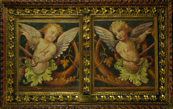 Scuola Lombarda, XVI sec. Putti cm. 52x46 coppia di pannelli ad affresco strappato riportato su tela in antica cornice intagliata, dipinta e dorata