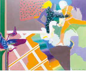 GOTTARDO ORTELLI Viggiù 1938 - Varese 2003 LA STORIA DI LEDA, 1967/1968 acrilico su cartone, cm 50x60. Intitolato e firmato in basso a destra: La storia di Leda – ortelli. Provenienza: Milano, Gottardo Ortelli (timbro al retro); Milano, Galleria d’Arte Vinciana (timbro al retro).
