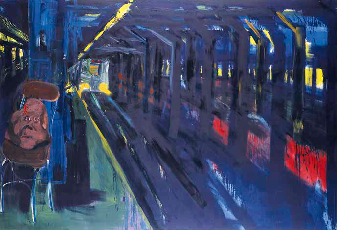 RAINER FETTING Wilhelmshaven 1949 HALLOWEEN MASK IN SUBWAY, 1985 olio e acrilico su tela, cm 213x310. Firmato, titolato e datato al verso: Halloween mask in subway Fetting 85. Autentica su foto di Enzo Cannaviello. 78. Provenienza: Milano, Studio d’Arte Cannaviello; Torino, Collezione privata (dal 12.12.1986).
