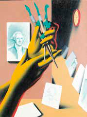MARK KOSTABI Los Angeles 1960 DEDICATION, 2003 olio su tela, cm 60x45. Firmato e datato in alto a destra: Kostabi 2003. Firmato, datato e titolato al verso: Mark Kostabi Dedication 2003. Provenienza: Modena, Galleria ModenArte (etichetta al verso); Collezione privata.