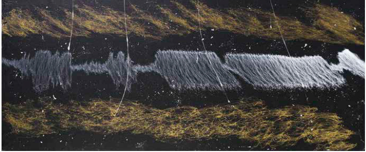 OTTAVIO FABBRI Milano 1946 GRAVITATIONAL WAVES, 2016 tecnica mista su tela, cm 50,2x120. Iscritto al verso: “Gravitational Waves” 2016 Ottavio Fabbri/Archivio 1179/2018 “I have already seen Fabbri’s paintings in space” Buzz Alohin- Apollo II, 1st lunar mission.