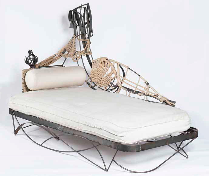 RENATO BASSOLI (1915-1982) Chaise – longue in metallo patinato e corde, 1950 circa dimensioni: cm 132x190x93. Pezzo unico. Esposizioni: Monaco, Museo Villa Stuck, Die Fünfziger: Stilkonturen eines Jahrzehnts. Italien, Skandinavien, Frankreich, Deutschland, USA, Polen, England, Niederlande, 13 gennaio – 26 febbraio 1984. Bibliografia: AA. VV., Die Fünfziger: Stilkonturen eines Jahrzehnts. Italien, Skandinavien, Frankreich, Deutschland, USA, Polen, England, Niederlande, catalogo della mostra, Monaco, 1984, pag. 104, n. 173, riprodotto