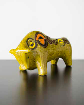 ALDO LONDI (1911-2003) ROSENTHAL NETTER BITOSSI Toro in ceramica smaltata, anni ’60. Reca vecchia etichetta: CREATED IN ITALY FOR Rosenthal Netter. Marca: 98/14 ITALY lunghezza: cm 31.