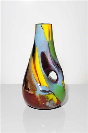 DINO MARTENS (1894-1970) VETRERIA AURELIANO TOSO Vaso della serie “Oriente” con foro laterale e decoro a macchie policrome, 1950 circa altezza: cm 31. Esposizioni: Monaco, Museo Villa Stuck, Die Fünfziger: Stilkonturen eines Jahrzehnts. Italien, Skandinavien, Frankreich, Deutschland, USA, Polen, England, Niederlande, 13 gennaio – 26 febbraio 1984. Bibliografia: AA. VV., Die Fünfziger: Stilkonturen eines Jahrzehnts. Italien, Skandinavien, Frankreich, Deutschland, USA, Polen, England, Niederlande, catalogo della mostra, Monaco, 1984, pag. 56, n. 36, riprodotto.