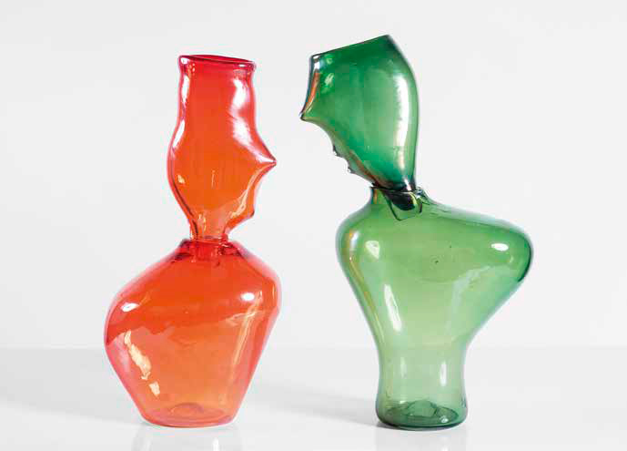 ANDRÉ VERDET (1913-2004) FUCINA DEGLI ANGELI Due figure componibili in vetro verde e rosso, Firma incisa: 1/3 A. Verdet/ Fucina Angeli Venezia 62 G. Nason. altezze: cm 63,5; cm 66. Esposizioni: Venezia, Fucina degli Angeli, 1970; Monaco, Museo Villa Stuck, Die Fünfziger: Stilkonturen eines Jahrzehnts. Italien, Skandinavien, Frankreich, Deutschland, USA, Polen, England, Niederlande, 13 gennaio – 26 febbraio 1984. Bibliografia: AA. VV., Fucina degli Angeli, catalogo della mostra, Venezia 1970, riprodotto; AA. VV., Die Fünfziger: Stilkonturen eines Jahrzehnts. Italien, Skandinavien, Frankreich, Deutschland, USA, Polen, England, Niederlande, catalogo della mostra, Monaco, 1984, pag. 52, n. 22, riprodotto.