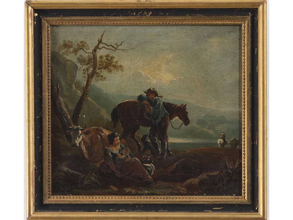 Lotto 11 | Scuola olandese (XIX secolo) Paesaggio co figure ed animali 30x34 cm Olio su...