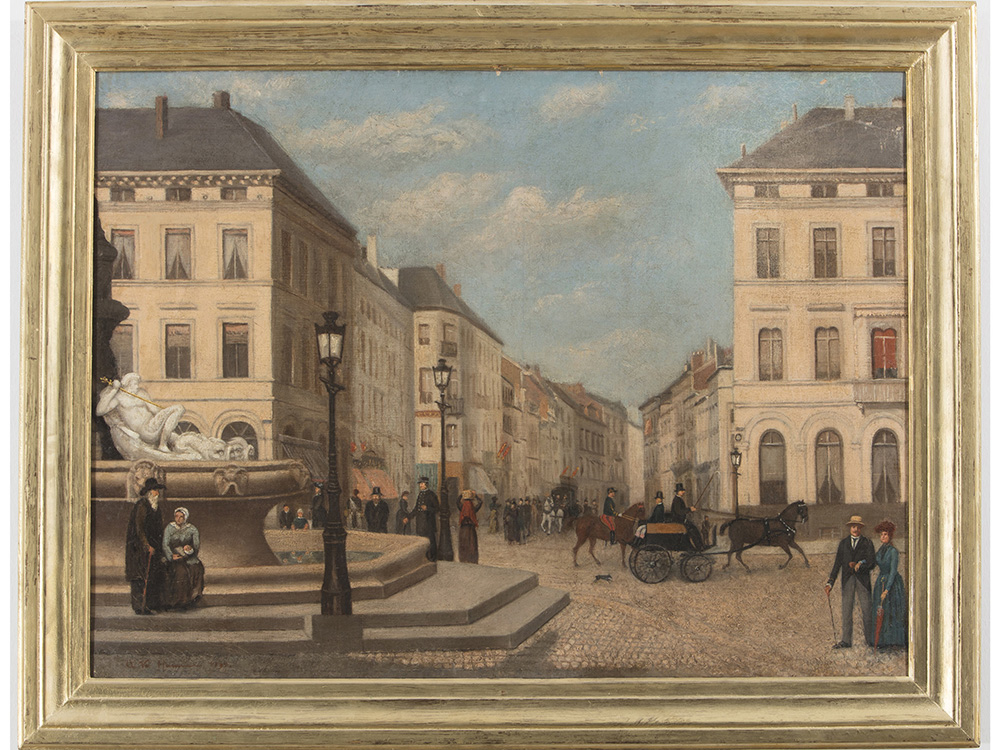 Firma illeggibile (XIX secolo) Bruxelles Porte de Namur con fontana di Brouckère60x80 cm Olio su tela