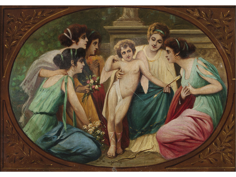 Anonimo (XX secolo) Fanciulle osservano cupido 54x74 cm Olio su tela
