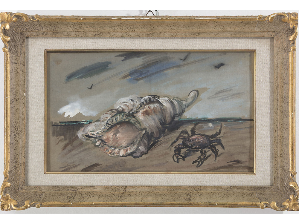 Anonimo (XX secolo) Spiaggia con conchiglia e granchio 25x42 cm Tempera su...