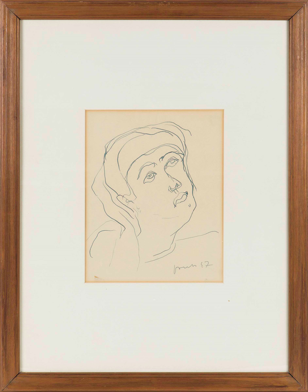 Lucio Fontana (1899-1968) Testa di donna, 1947 china blu su cartoncino, cm 37x26 firmato e datato in basso a destra Opera registrata presso l’Archivio Lucio Fontana, Milano, con il n. 842/2 Si tratta del bozzetto per la quinta porta del Duomo di Milano Provenienza: Galleria Biuart, Varese, ivi acquistato dall'attuale proprietario Esposizioni: Galleria Biuart, Varese, 1979 Grazie ai cento artisti, Chiesa di San Paolo, Gallarate, 1999 l'opera presenta segni di scotch in prossimità dei quattro angoli e imbrunimento della carta Lucio Fontana (1899-1968), Testa di donna, 1947 blue india ink on cardboard, cm 37x26 signed and dated lower right This work is registered at the Lucio Fontana Archive, Milan, with the n. 842/2 This is a sketch for the 5th Milan Duomo's door