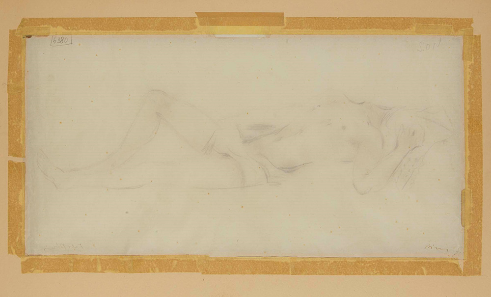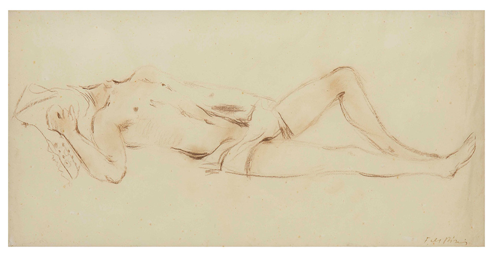 Filippo De Pisis (1896-1956) Nudo disteso, anni ‘30 pastello su carta velina, cm 25,4x49,5 Opera registrata presso l’Associazione per Filippo de Pisis con il n. 04919 L’opera presenta foxing diffuso su tutta la superficie, in parte è stato ritoccato con stesura di colore bianco Filippo De Pisis (1896-1956), Nudo disteso, 1930 ca crayon on tissue paper, cm 25,4x49,5 This work is registered at the Associazione per Filippo de Pisis with the n. 04919