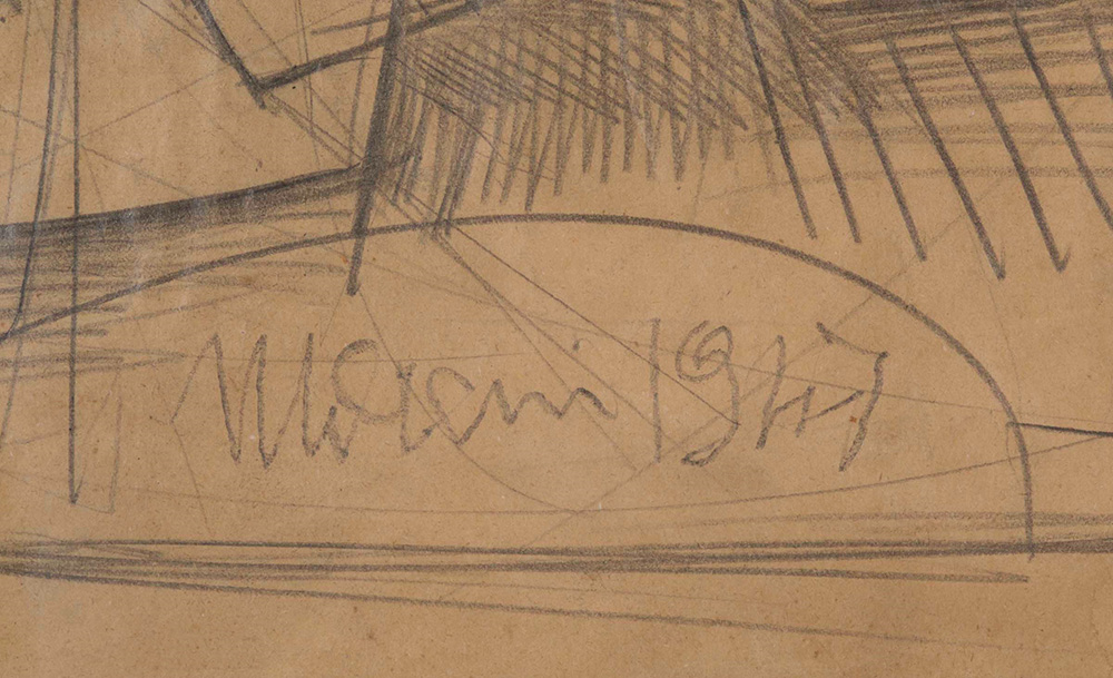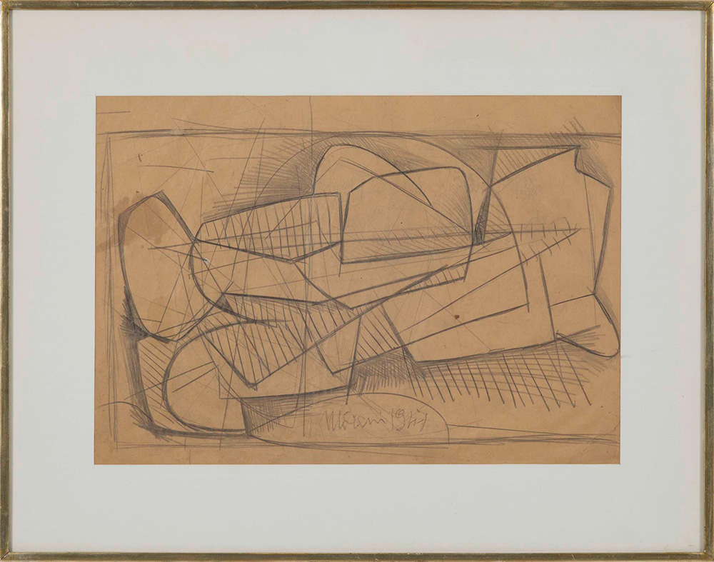 Mattia Moreni (1920-1999) Studio per composizione, 1947 matita su carta, cm 34x49 firmato e datato in basso al centro Autentica su fotografia dell'artista l'opera presenta due macchie brune nel bordo di sinistra Mattia Moreni (1920-1999), Study for composition, 1947 pencil on paper, cm 34x49 signed and dated lower side Photo certificate signed by the artist