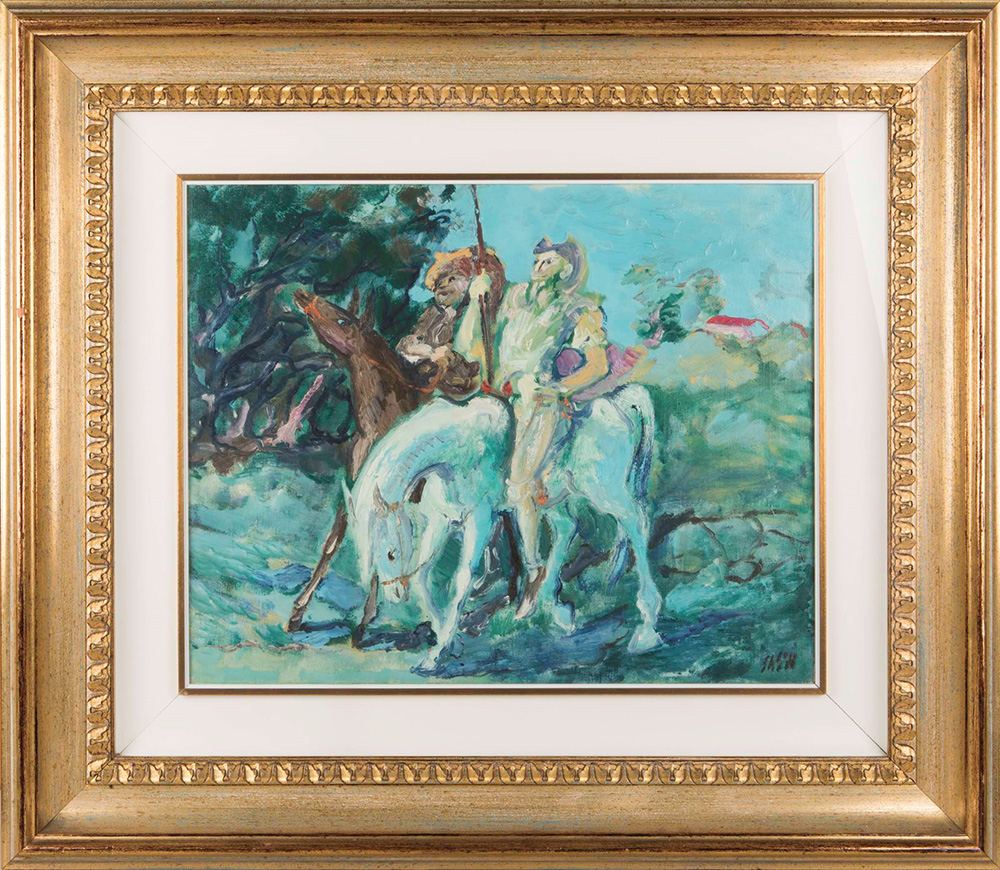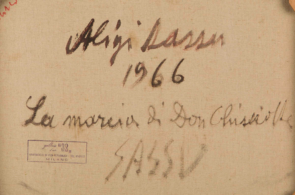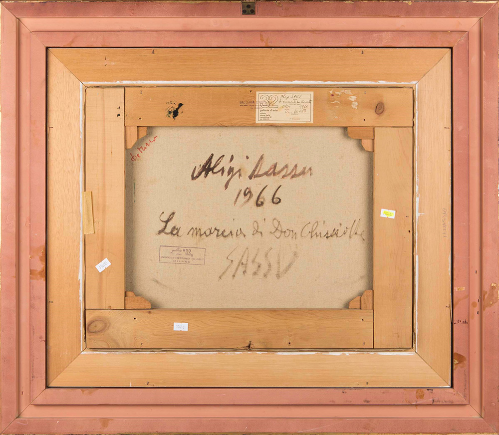 Aligi Sassu (1912-2000) La marcia di Don Chisciotte, 1966 olio su tela, cm 50x40 firmato in basso a destra firmato, intitolato e datato al retro Autentica su fotografia dell’artista in data 30 giugno 1970 Provenienza: Galleria d'Arte 32, Milano Galleria La Cornice, Parma, ivi acquistato dall’attuale proprietario l’opera presenta craquelures in corrispondenza della parte superiore destra Aligi Sassu (1912-2000), The march of Don Chisciotte, 1966 oil on canvas, cm 50x40 signed lower right signet, titled and dated on the back Photo certificate signed by the artist 30/06/1970