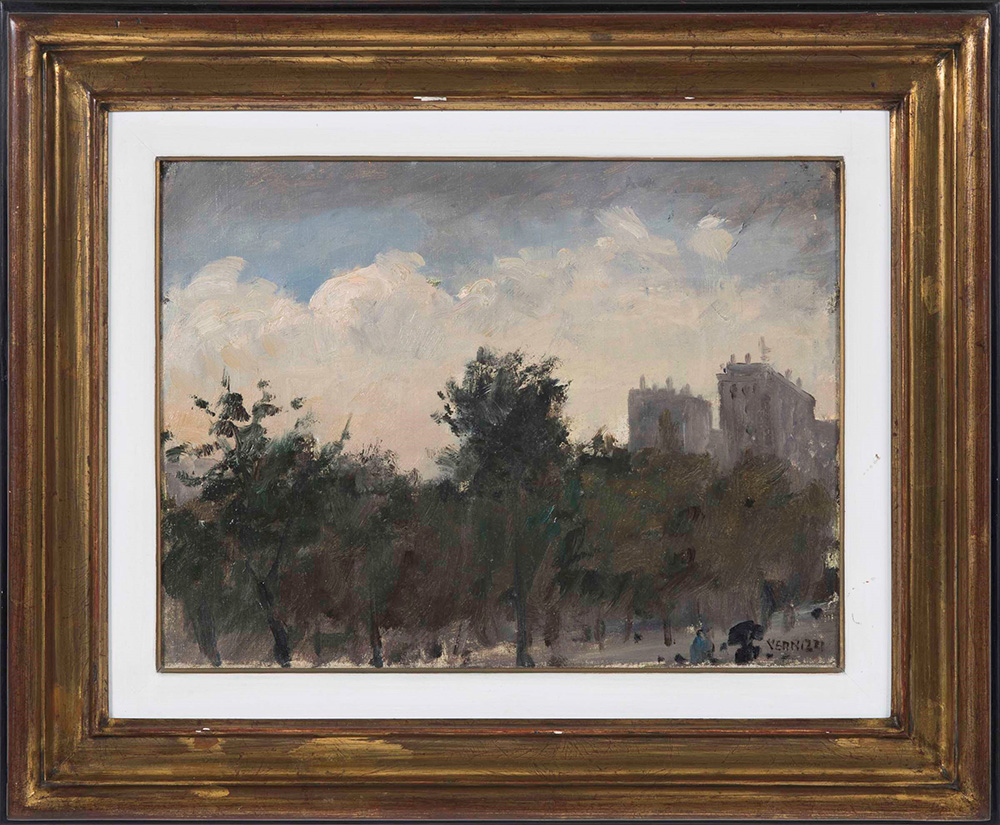 Renato Vernizzi (1904-1972) Periferia olio su tela, cm 30x40 firmato in basso a destra Provenienza: Galleria La Cornice, Parma, ivi acquistato dall’attuale proprietario in buono stato conservativo Renato Vernizzi (1904-1972), Periphery oil on canvas, cm 30x40 signed lower right