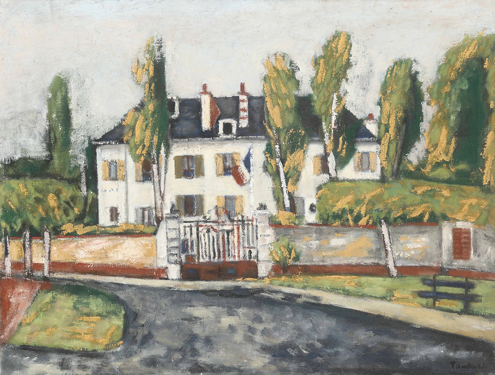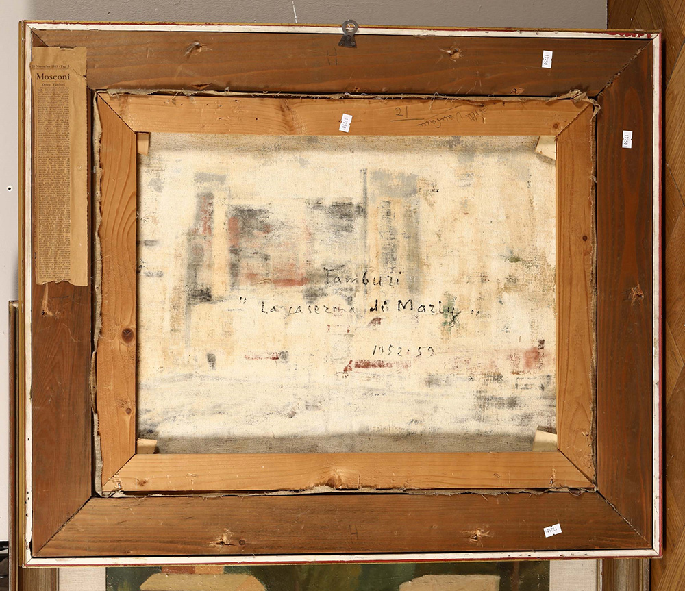 Orfeo Tamburi (1910-1994) La caserma di Marig, 1952-1959 olio su tela, cm 50x65 firmato in basso a destra firmato, intitolato e datato al retro Provenienza: Galleria Russo, Roma, ivi acquistato dall’attuale proprietario ondulazione della tela, necessita di essere ritensionata Orfeo Tamburi (1910-1994), La caserma di Marig, 1952-1959 oil on canvas, cm 50x65 signed lower right signed, titled and dated on the back