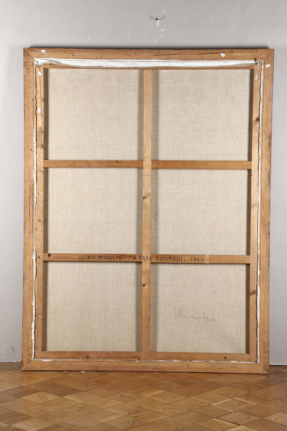 Plinio Mesciulam (1926) Oremus Pro Iudaeis, 1963 tecnica mista su tela, cm 158x119 firmato, datato e dedicato al retro l'opera presenta una patina di sporco facilmente rimovibile Plinio Mesciulam (1926), Oremus Pro Iudaeis, 1963 mixed media on canvas, cm 158x119 signed, dated and dedicated on the back