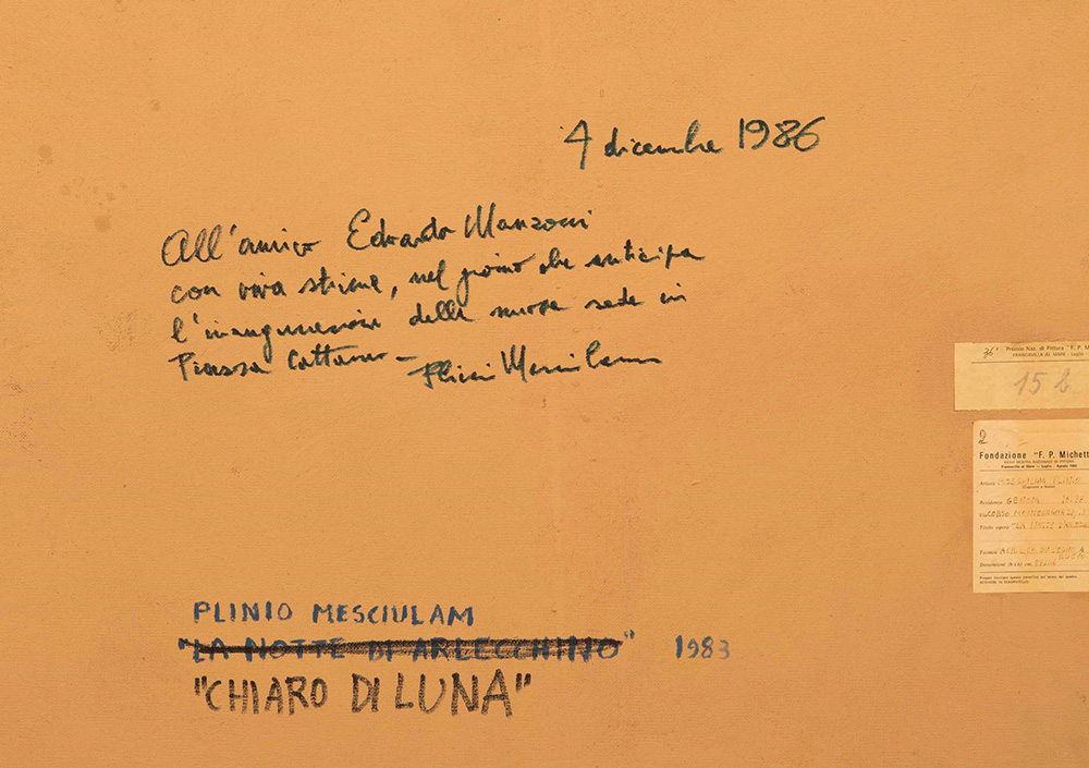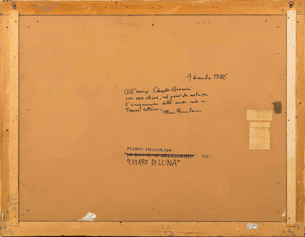 Plinio Mesciulam (1926) Chiaro di luna, 1983 tecnica mista su tavola, cm 100x130 firmato in basso a destra firmato, intitolato e datato al retro Etichetta al retro della Fondazione F.P. Michetti, XXXVI Mostra Internazionale di pittura, Francavilla al Mare, luglio-agosto 1983 Provenienza: MART, Museo di Arte Moderna e Contemporanea di Trento e Rovereto, Rovereto Collezione VAF Stiftung, Francoforte sul Meno Galleria La Polena, Genova Esposizioni: La magnifica ossessione, a cura di N. Boschiero, V. Caciollli, D. Dogheria, D.Ferrari, M. Mariech, P. Pettenella, A. Tiddia, D. Viva, Rovereto, MART, Museo di Arte Moderna e Contemporanea di Trento e Rovereto, Rovereto, 26 ottobre 2012-16 febbraio 2014 XXXVI Mostra Internazionale di pittura, Francavilla al Mare, luglio-agosto 1983 l’opera presenta nell’angolo inferiore di sinistra un sollevamento del colore. Mancanza di colore nel bordo sinistro di cm 0,50 Plinio Mesciulam (1926), Chiaro di luna, 1983 mixed media on board, cm 100x130 signed lower right signed, titled and dated on the back Label of Fondazione F.P. Michetti, XXXVI Mostra Internazionale di pittura, Francavilla al Mare, July-August 1983 on the back