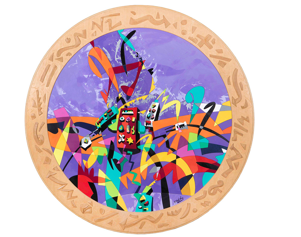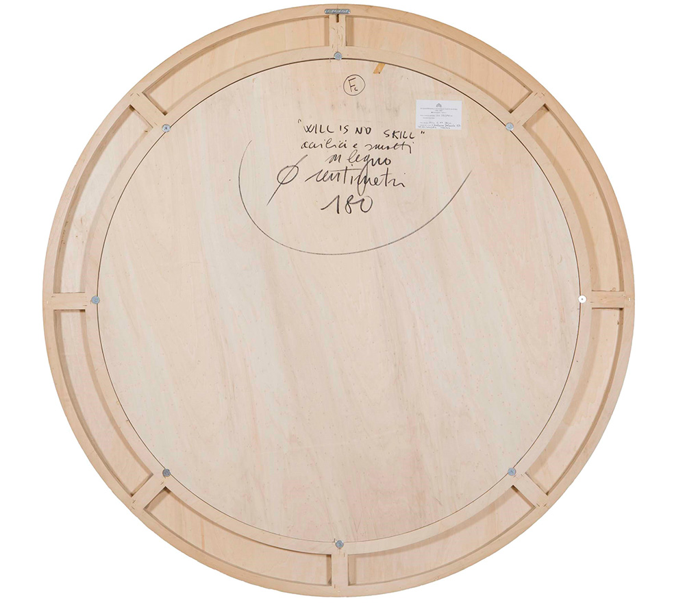 Ugo Nespolo (1941) Will is no skill, 1990 acrilici e smalti su tavola, diametro cm 180 firmato in basso a destra firmato, intitolato e datato al retro Etichetta al retro della XII Quadriennale Nazionale d’Arte di Roma, 1992-1995 Provenienza: Collezione privata, Milano Collezione privata, Torino Esposizioni: XII Quadriennale Nazionale d’Arte di Roma, 1992-1995 Ugo Nespolo (1941), Will is no skill, 1990 acrylics and enamlens on board, diameter cm 180 signed lower right signed, titled and dated on the back Label of XII Quadriennale Nazionale d’Arte di Roma, 1992-1995 on the back