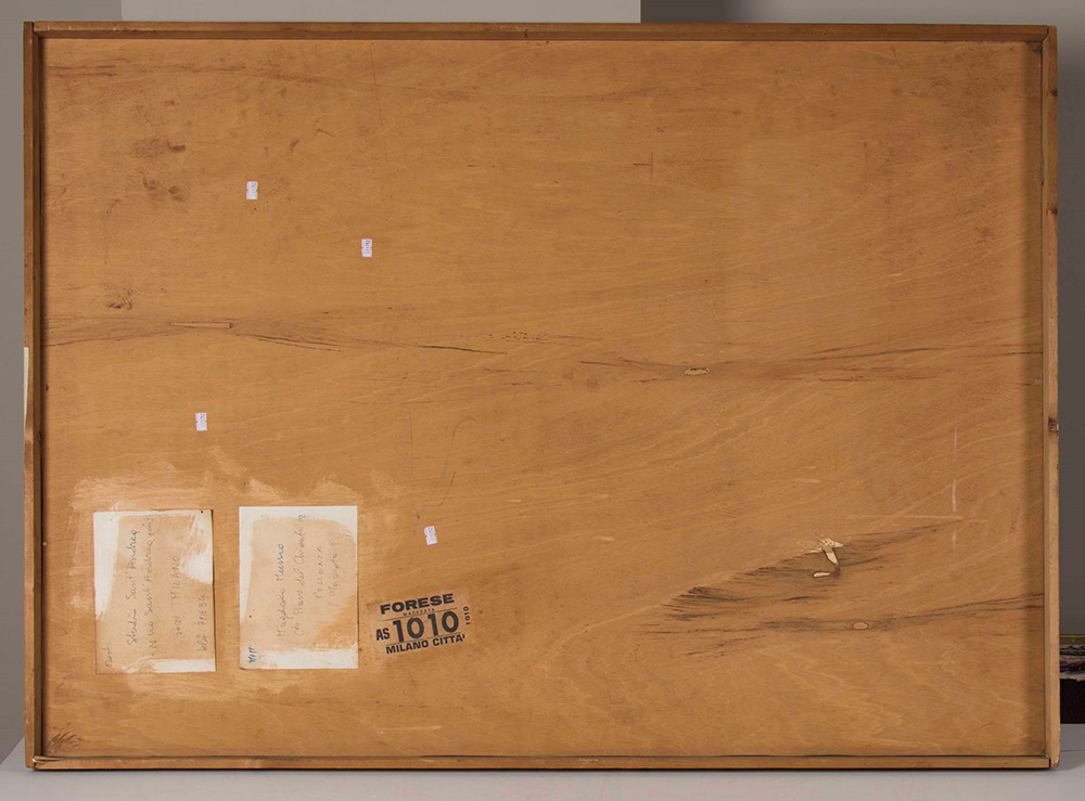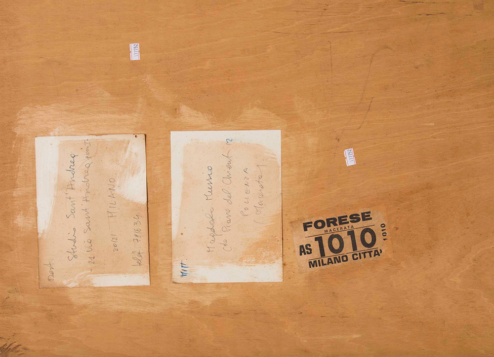 Magdalo Mussio (1925-2006) Senza titolo, anni ‘80 collage e tecnica mista su tavola, cm 85,5x120 firmato dall’artista su etichetta al retro difetti l'opera presenta nella parte centrale verso l'alto un distaccamento della carta dovuto ad uno strappo Magdalo Mussio (1925-2006), Untitled, 1980 ca collage and mixed media on board, cm 85,5x120 signed by the artist on a label on the back