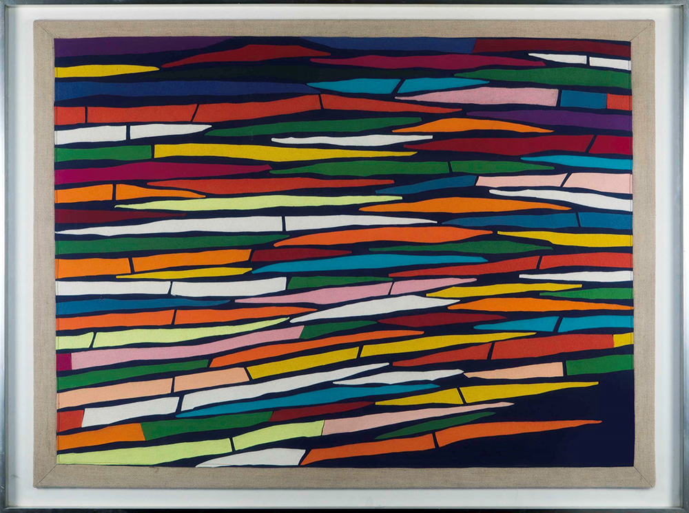 Piero Dorazio (1927-2005) Composizione n. 7, 1974 multiplo in feltro, cm 89x118,5 es. 34/75 l'opera presenta in basso a sinistra in corrispondenza del rettangolino blu, nell'angolo di destra in corrispondenza del giallo e nel celeste sul bordo in alto mancanze di feltro dovute ad un infestazione di tarme, restaurabile Piero Dorazio (1927-2005), Composizione n. 7, 1974 multiple in felt, cm 89x118,5 es. 34/75